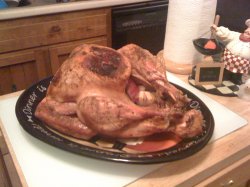 Hope everyone had a good Turkey Day. I played chef for my family and a few friends, and whipped up a turkey (which took 2 boxes of stock and 2 bottles of beer to make - lush turkey with a drinking problem, I tell ya!), ham, mashed taters, sweet tater casserole, green bean casserole (my own recipe) Michael Symon's fried brussel sprouts, homemade gravy, from-scratch cranberry sauce and lazy people's store bought rolls.