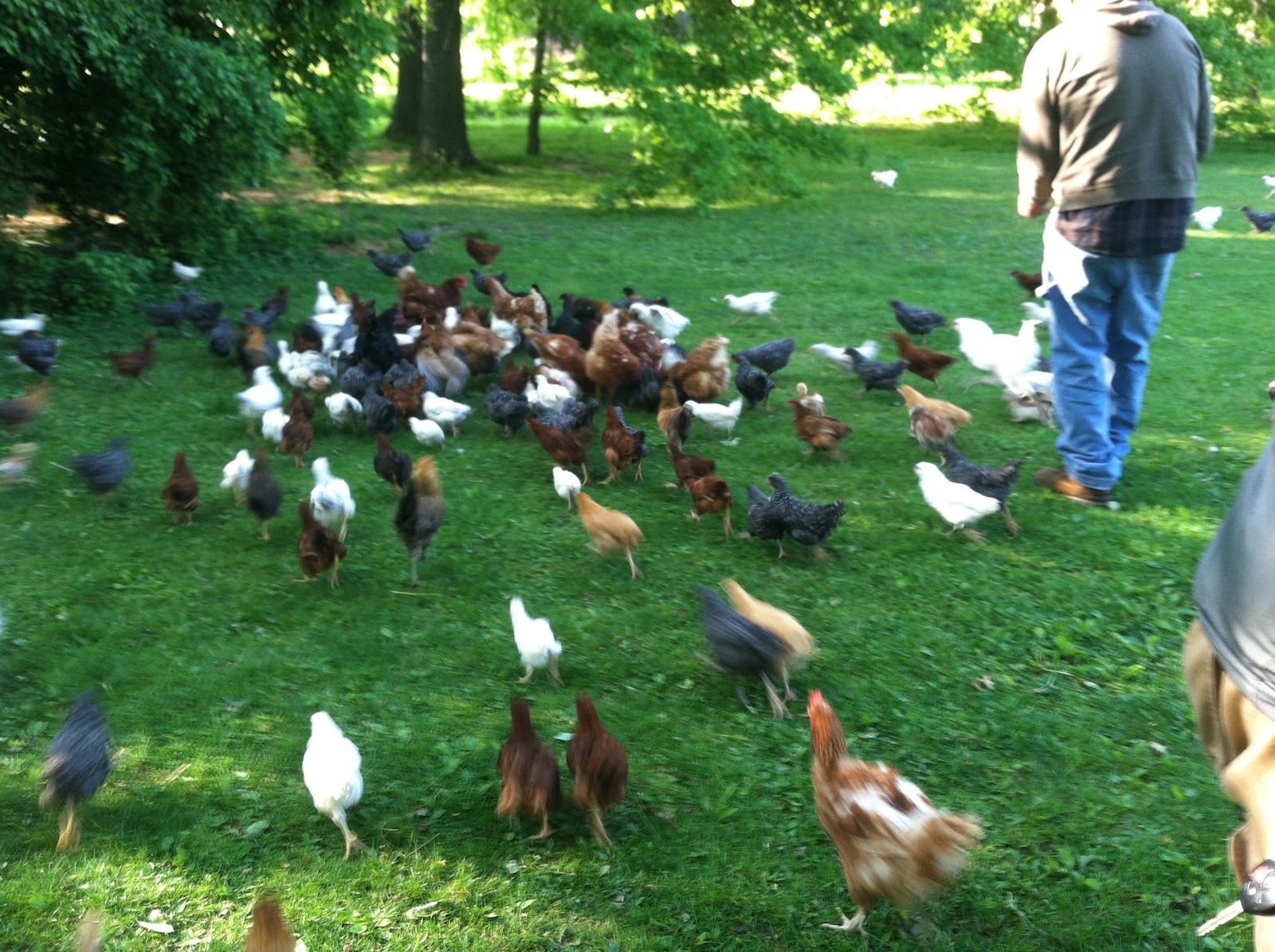 We saw a small flock of 20 or so chickens as we pulled up in the drive, and as we walked towards the back with him I casually asked how many chickens he had. His response - "Over 1,000"!!! Then they heard his voice and it was like the Pied Chicken Piper had played his magical instrument and they started coming out of the woodwork from everywhere.