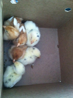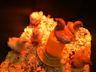 They started out living in a rubbermaid tote in the house... getting bigger, and bigger each day. Needed to be sure they were warm, safe and full-grown before being exposed to the elements in their outdoor coop. The house was full of cheerful chirps and a film of cedar chip dust covered pretty much everything in the room that wass their home for the first 2 - 3 months. (The kitties were far too intrigued with their cuteness and possible tastiness.)